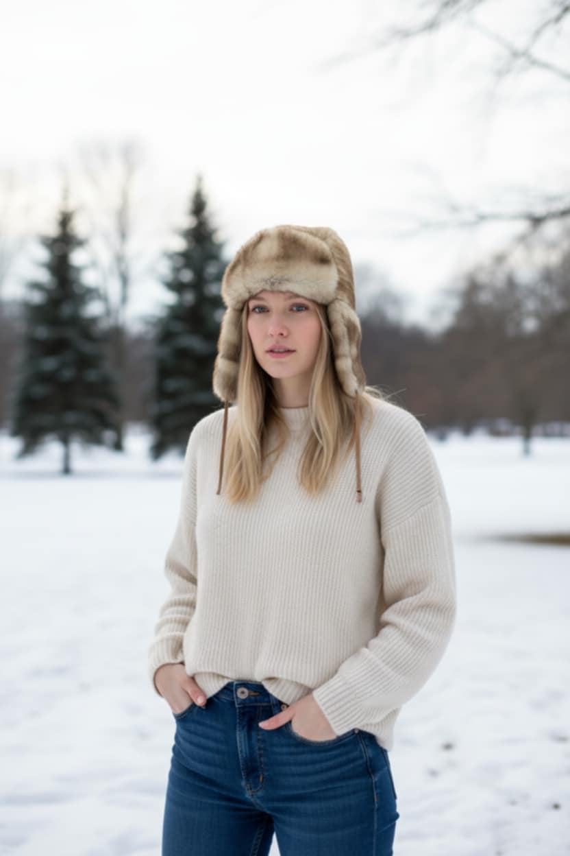 Orginali dirbtinio kailio kepurė su ausytėmis. Gali būti surišama, labai lengva ir šilta. Vidus pašiltintas, juodas pamušalas. Tai patikimai apsaugos nuo šalčio.