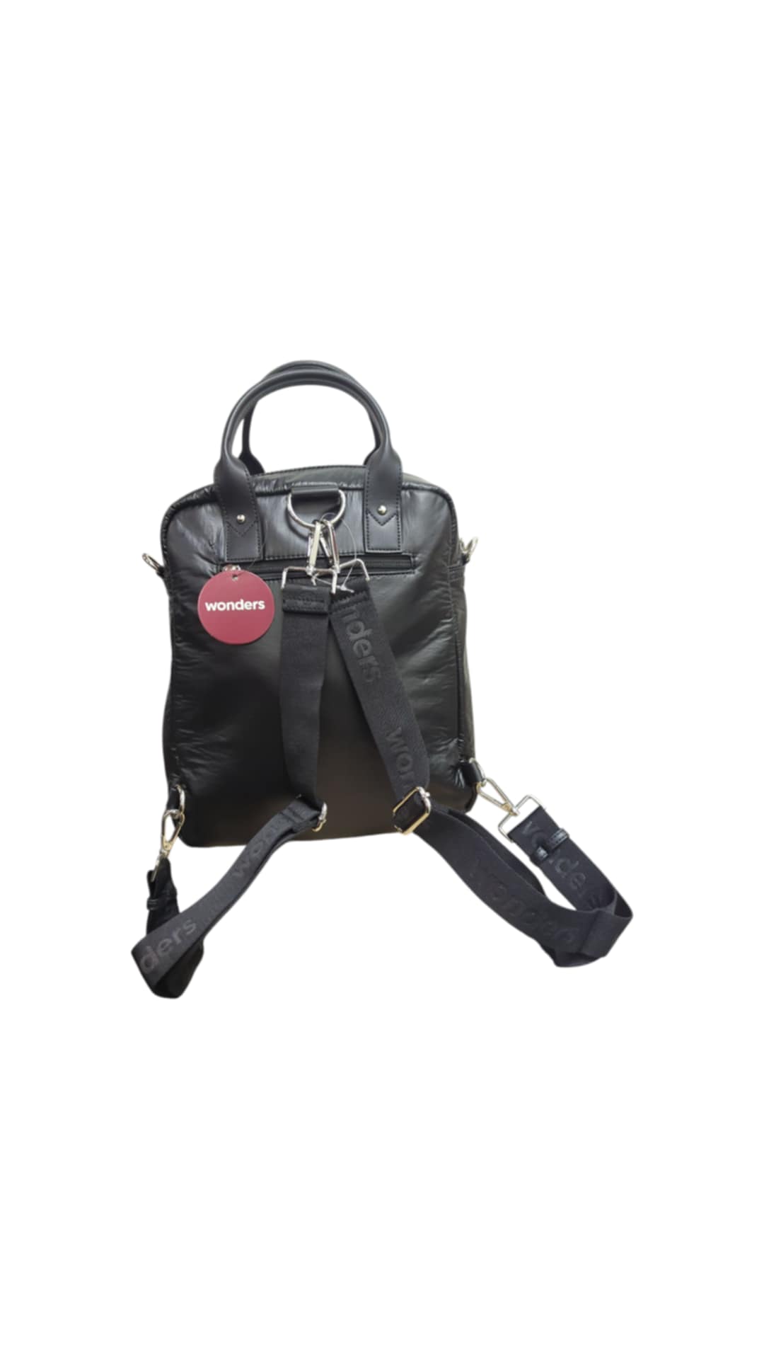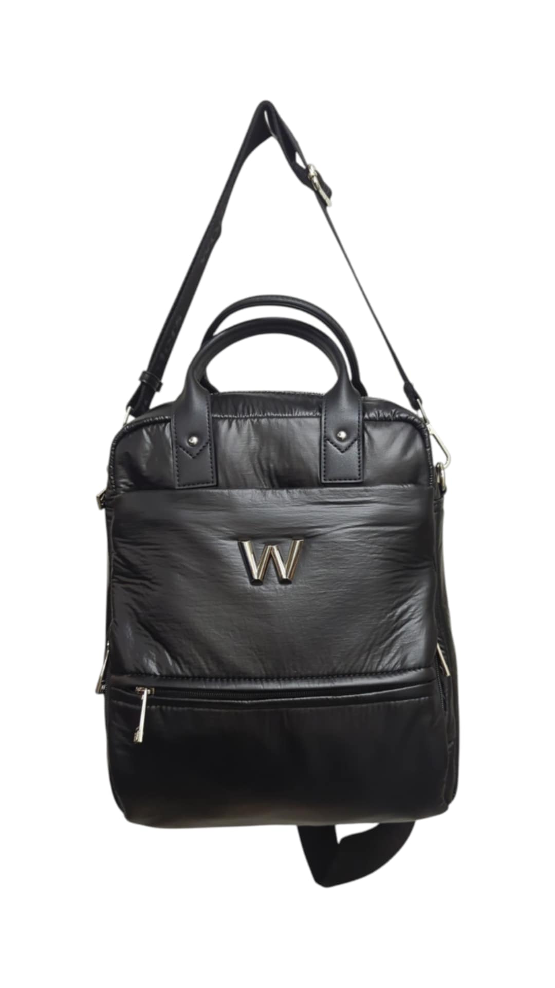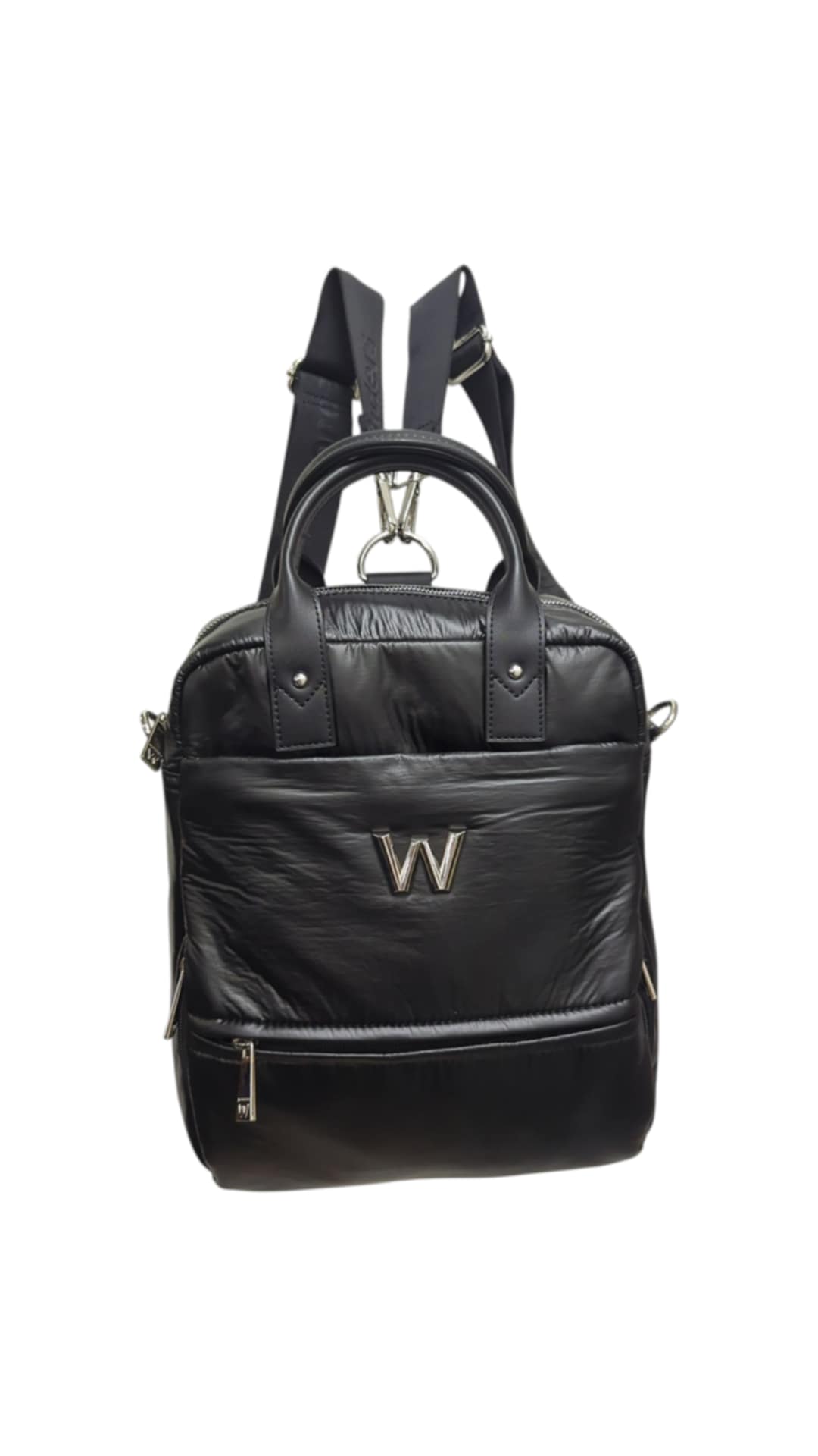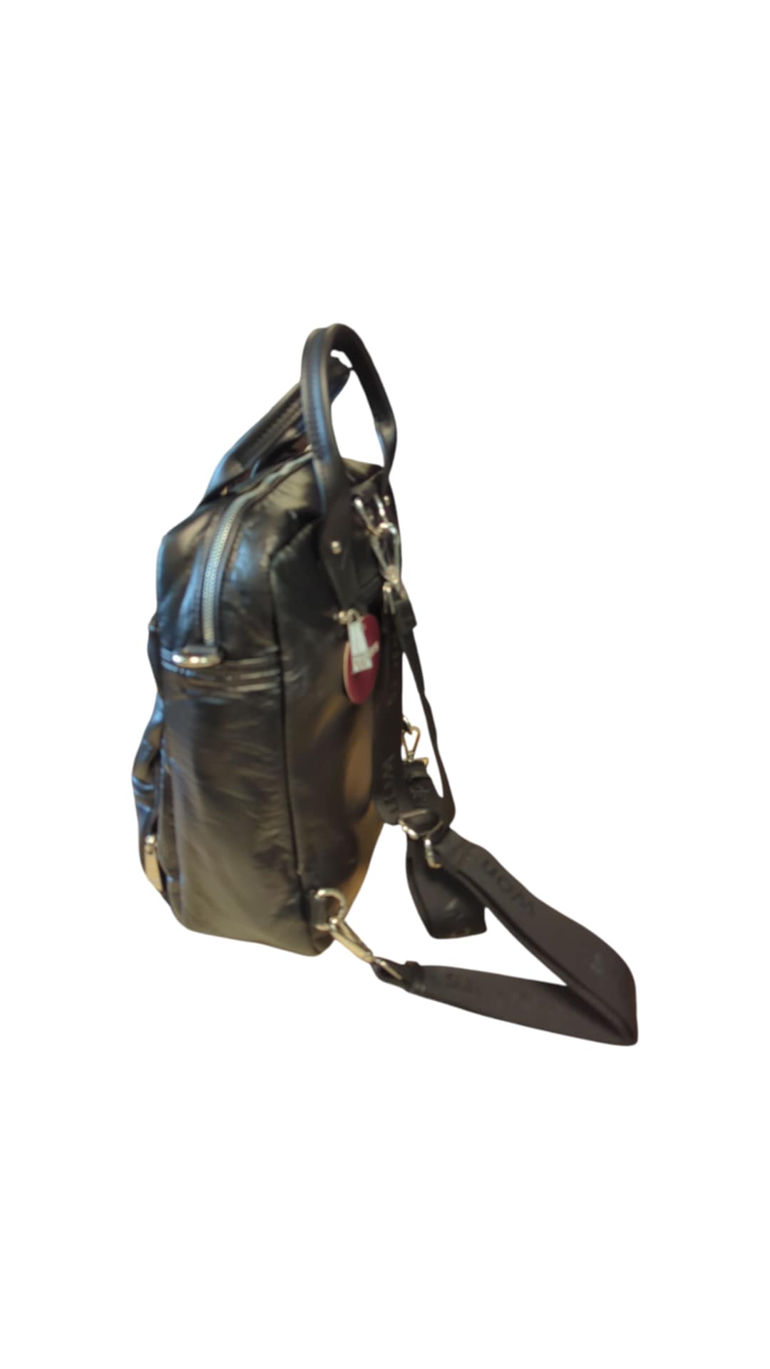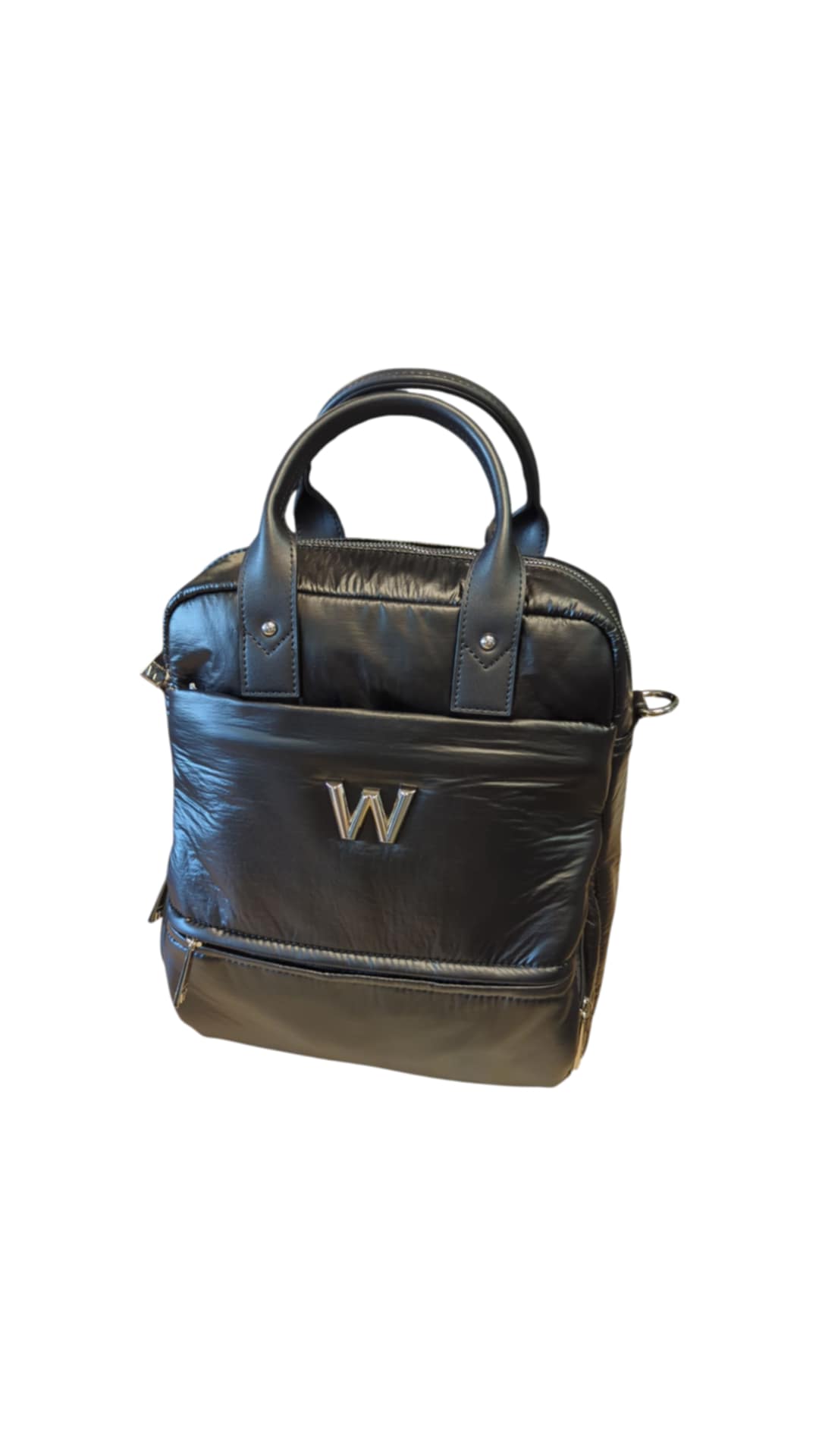 Išorėje 6 skyriai, užsegama užtrauktuku. Vidus su 2 skyriais , 1 užsegamas užtrauktuku, bei kišenėlė telefonui. Tai universalaus dydžio variantas, kurį galima naudotiu ir kaip rankinę, telpa loptopas, telefonas, bei piniginė, patogumas ir estetika. Kartu pridedama tekstilinis krepšys, rankinės įvilkimui.