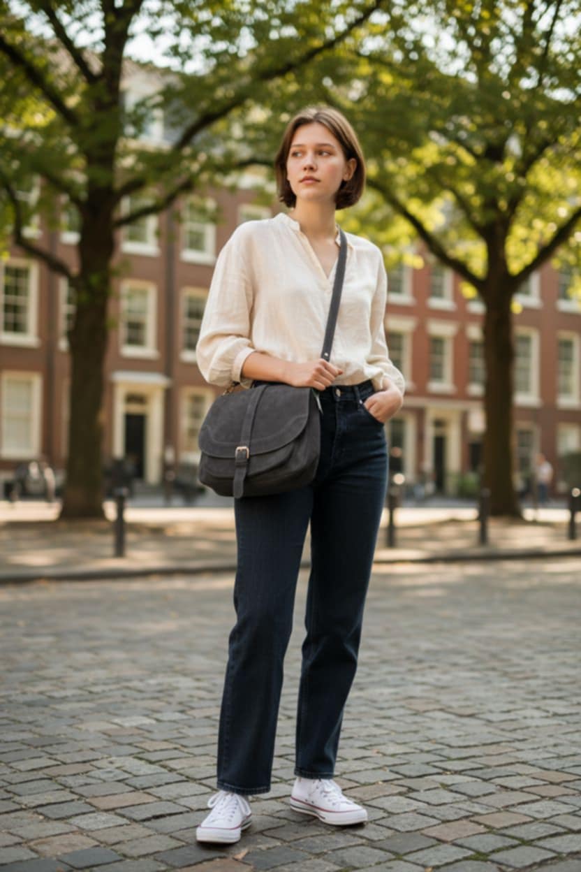 Išorėje vienas skyrius, užsegama sagtele. Vidus su  vienu skyriumi, vienas užsegamas užtrauktuku, bei kišenėlė telefonui.