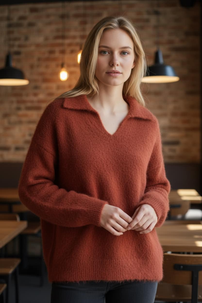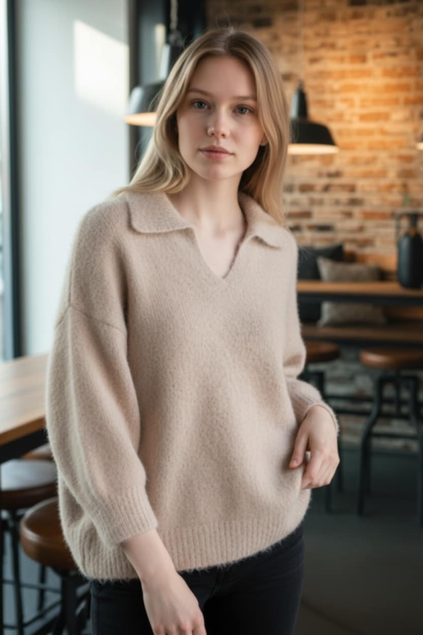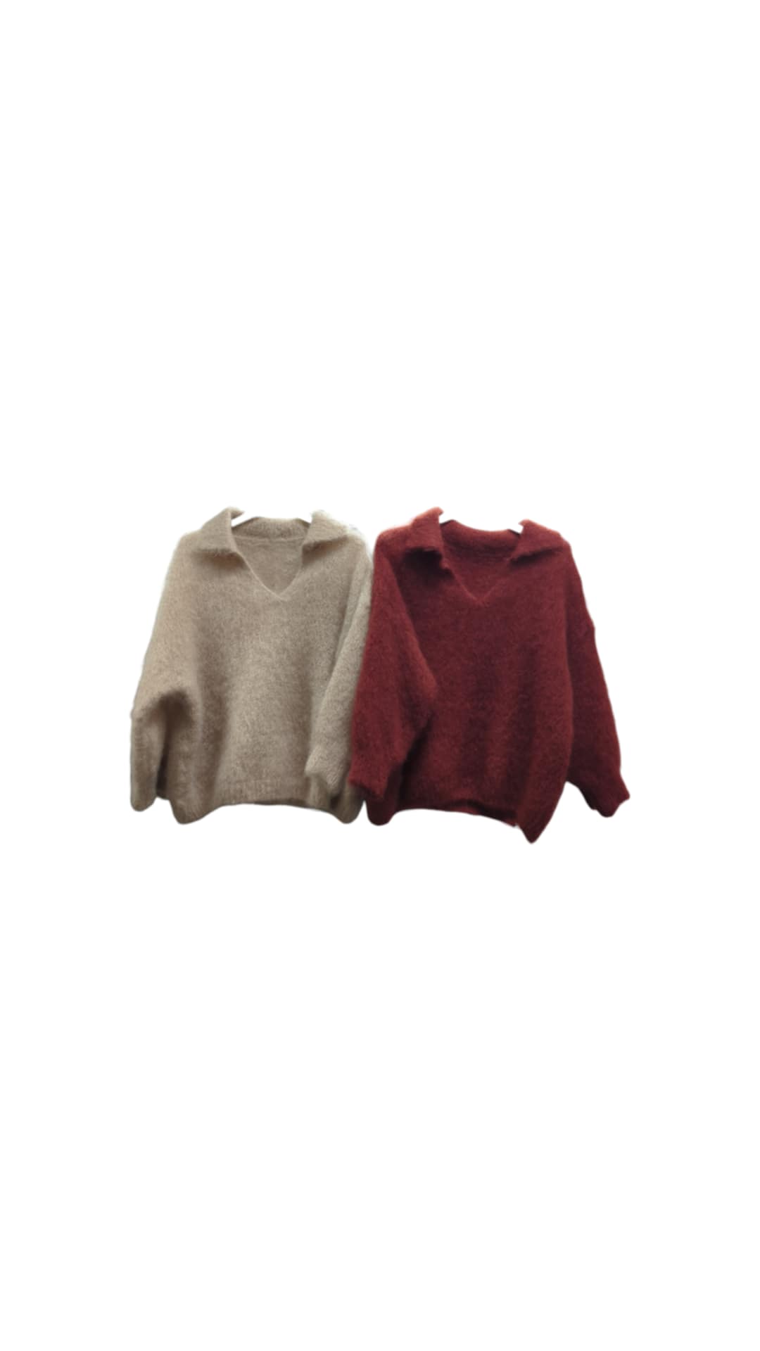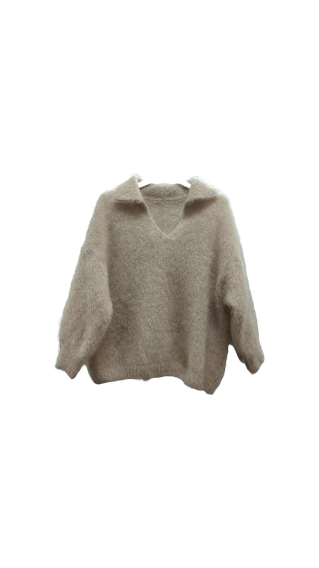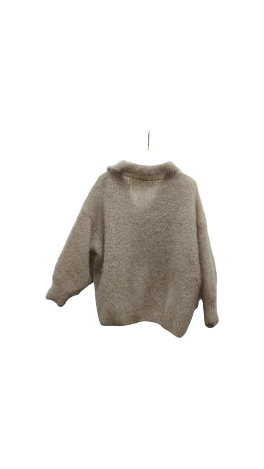 Megztinis Kid Mohair- ovaliu kaklu. Tai 80% vaikiška mohera (kid mohair) megztinis didesnio dydžio, patogus dėvėti, Rankovės platėjančios.