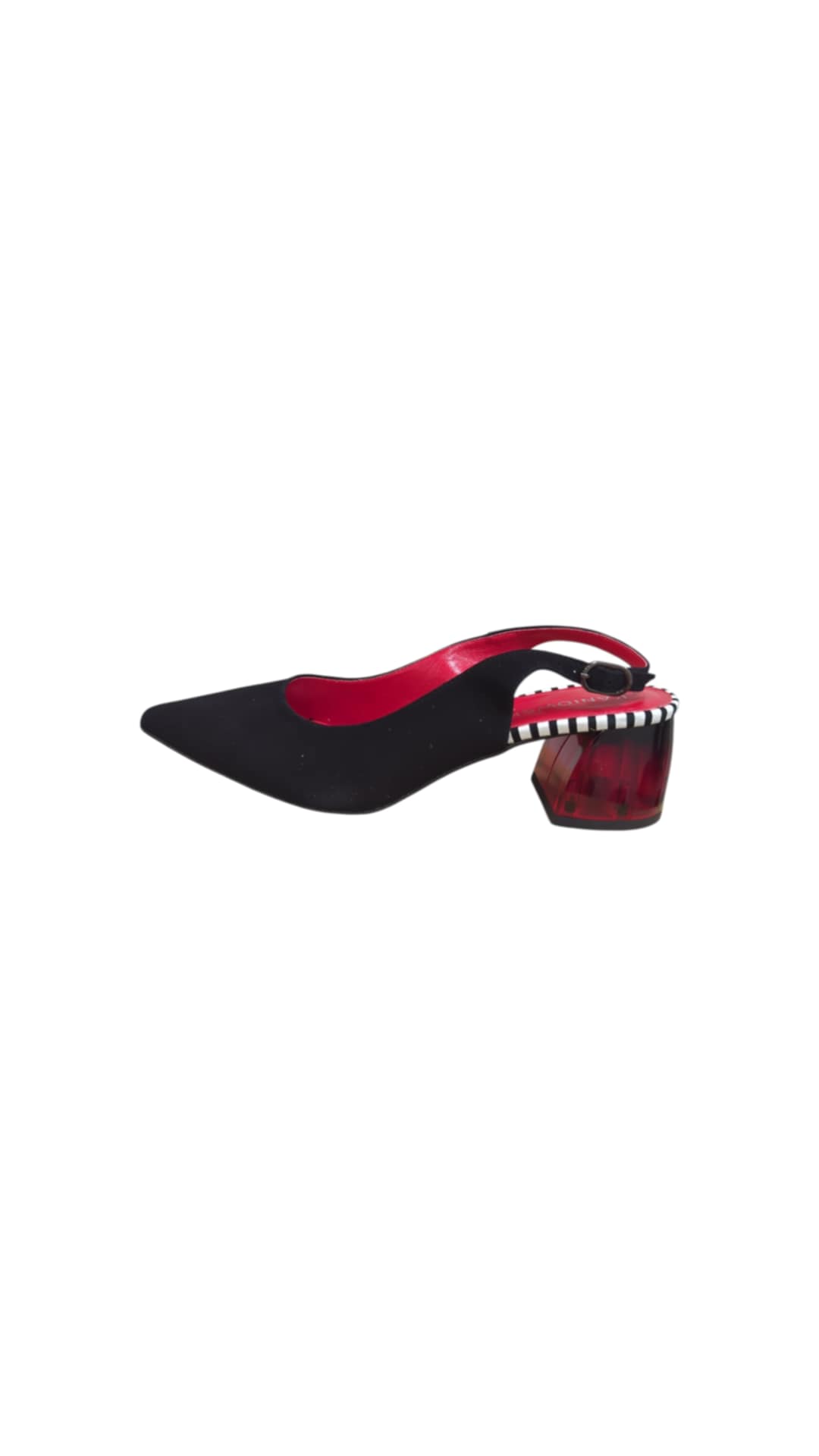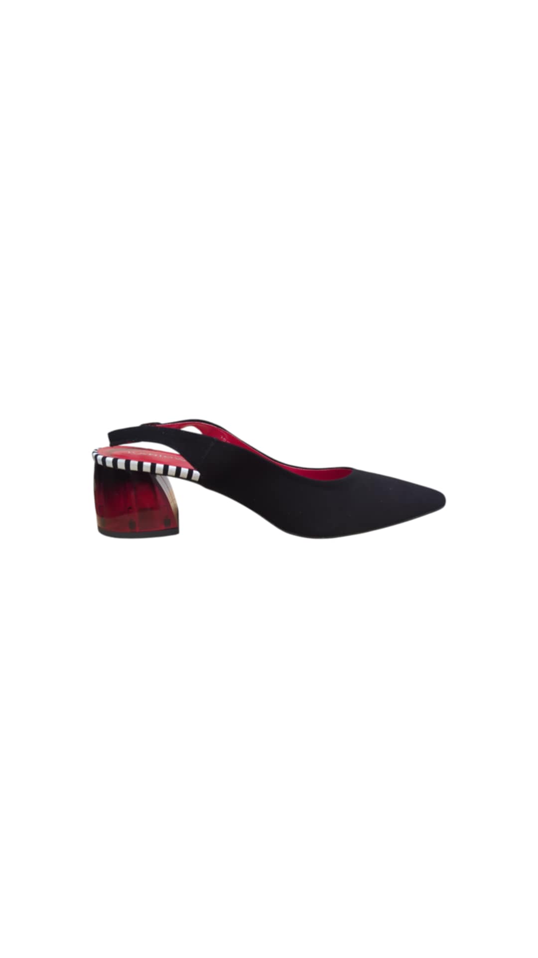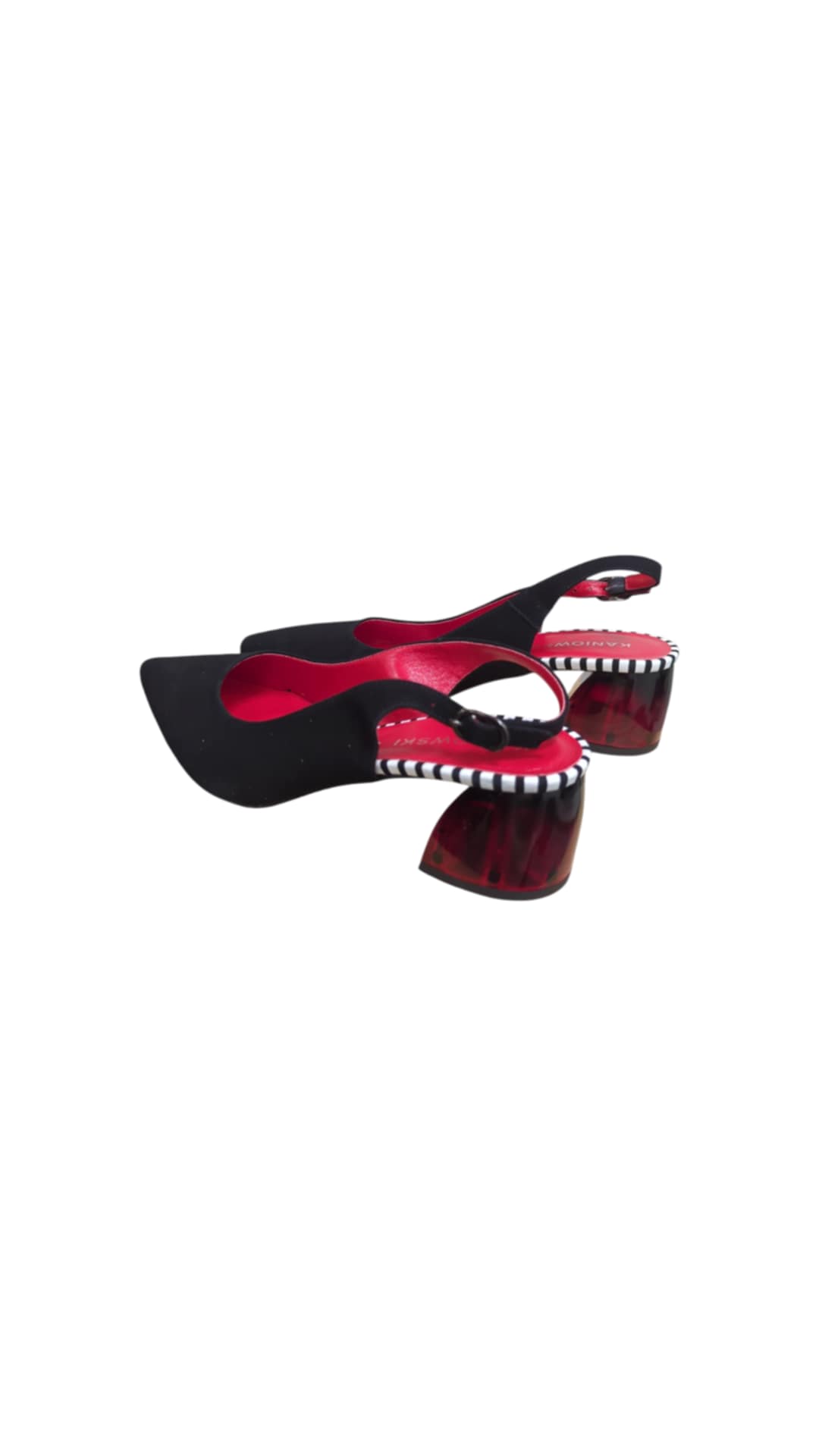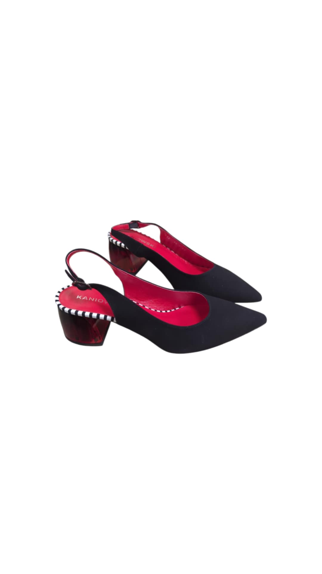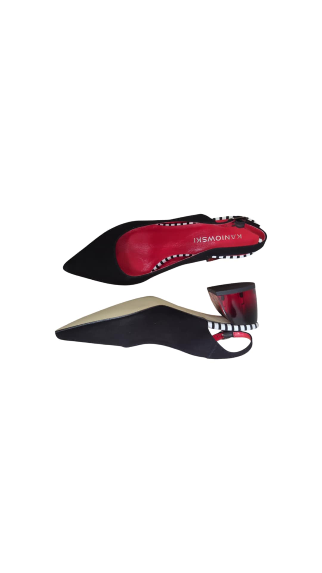 Verstos odos bateliai – KANIOWSKI– pilnai oda – versta oda, vidus raudonas, išorė juoda spalva, labai lengvi, uždarais pirštais, pilnai dengia kauliukus, puošti vidinė pakulnė su raudona spalvadirželiu ir maža sagtele, kulnas vilktas, apglėbiai pėdą, kulnas permatomas, tinka aukštai kelčiai.