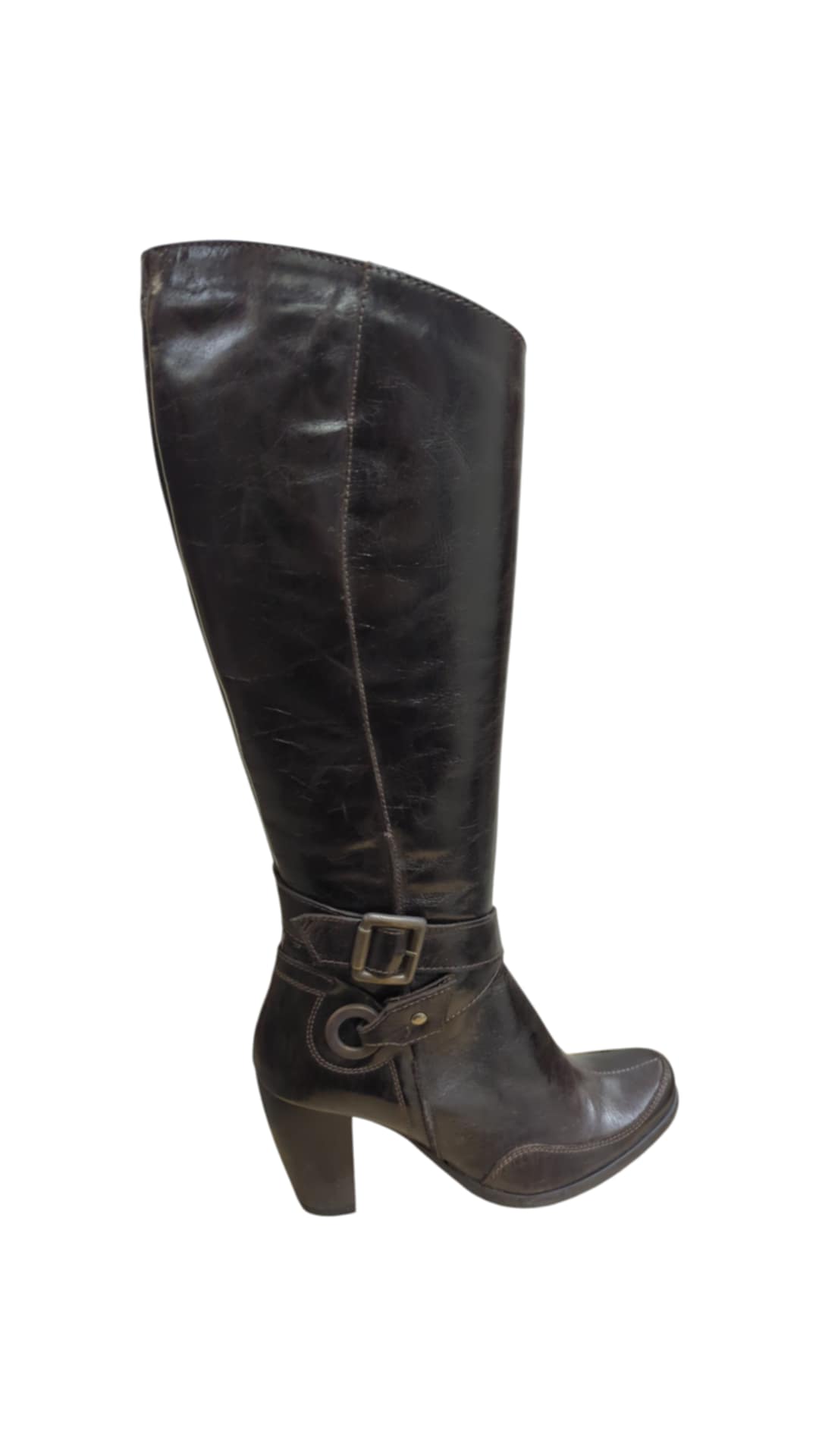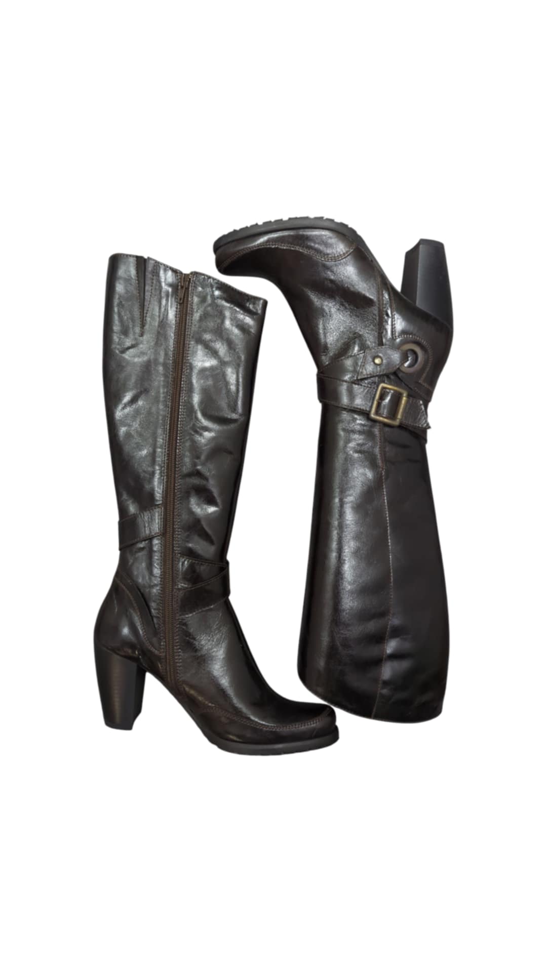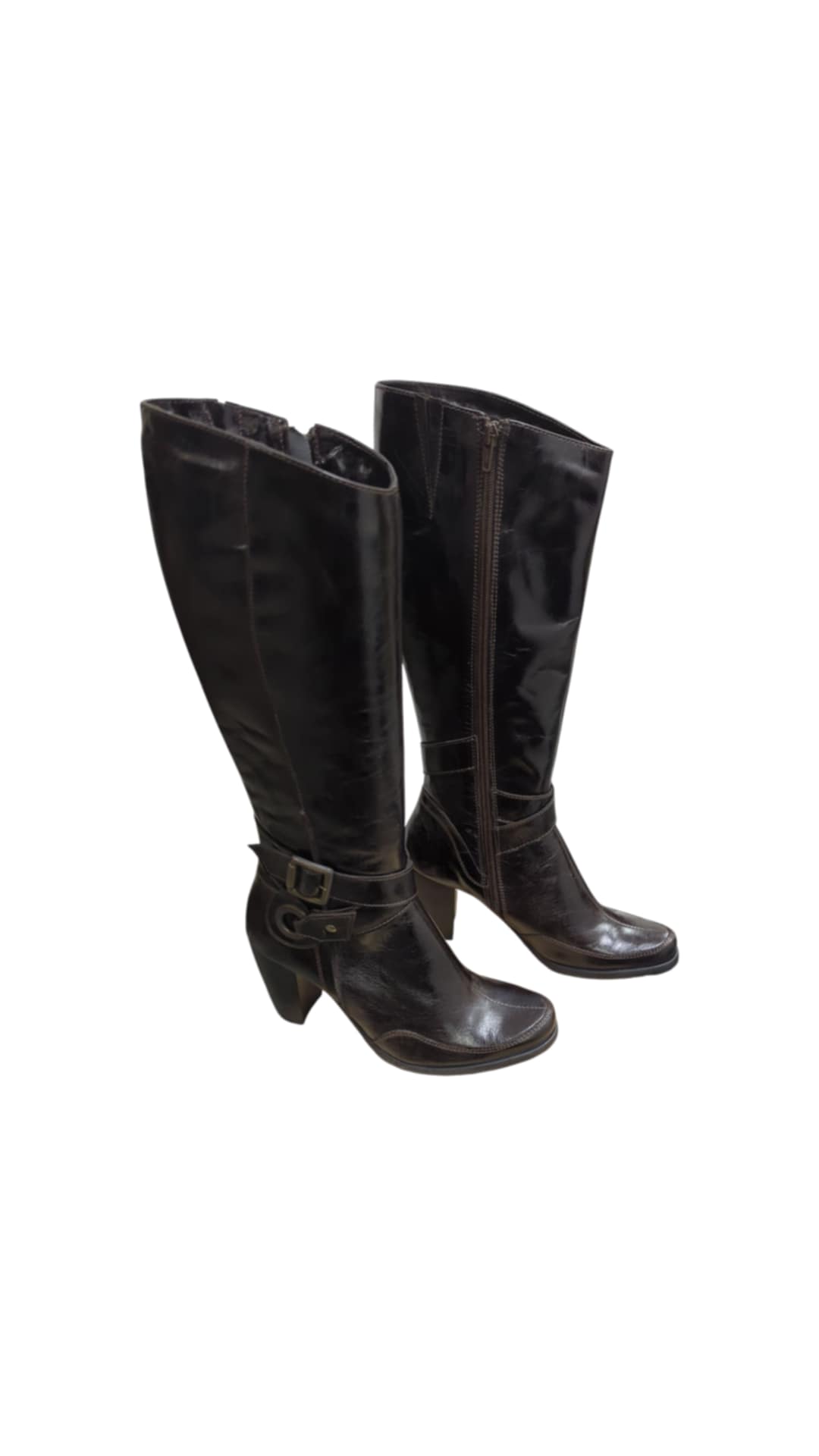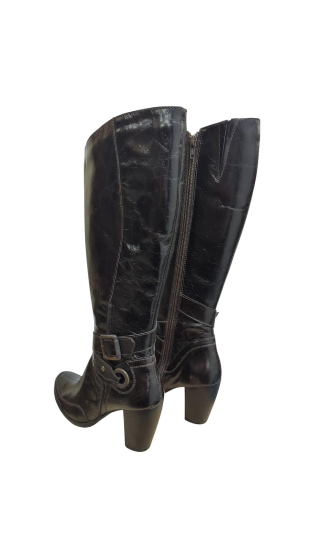 Moteriški lygios odos ilgaauliai, vidus su plonu flicu, išorė pilnai oda, padas – kaučiukas, vidus oda, įkišami ir užsegami užtrauktuku.