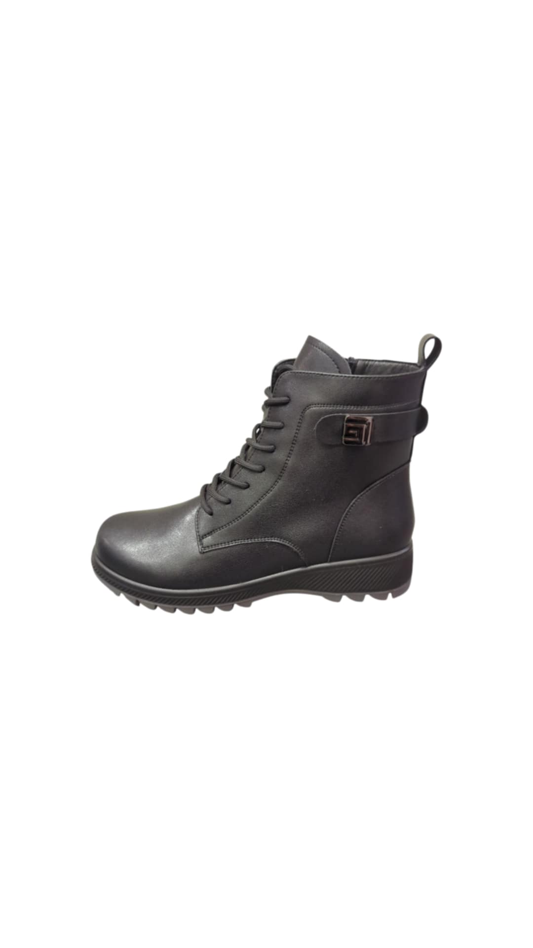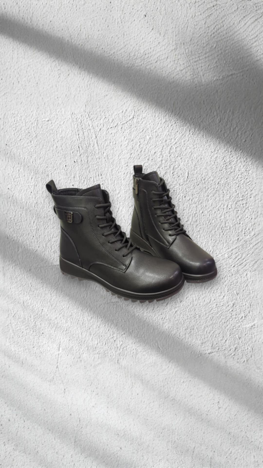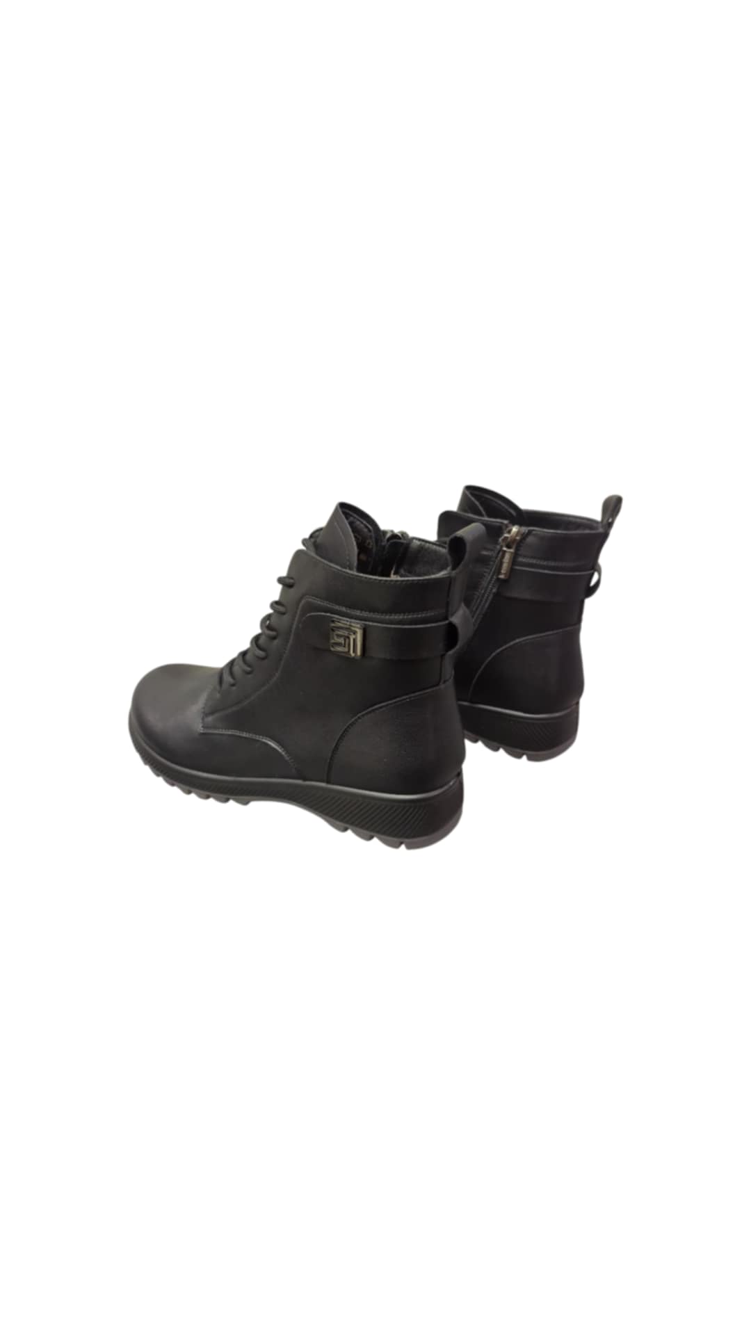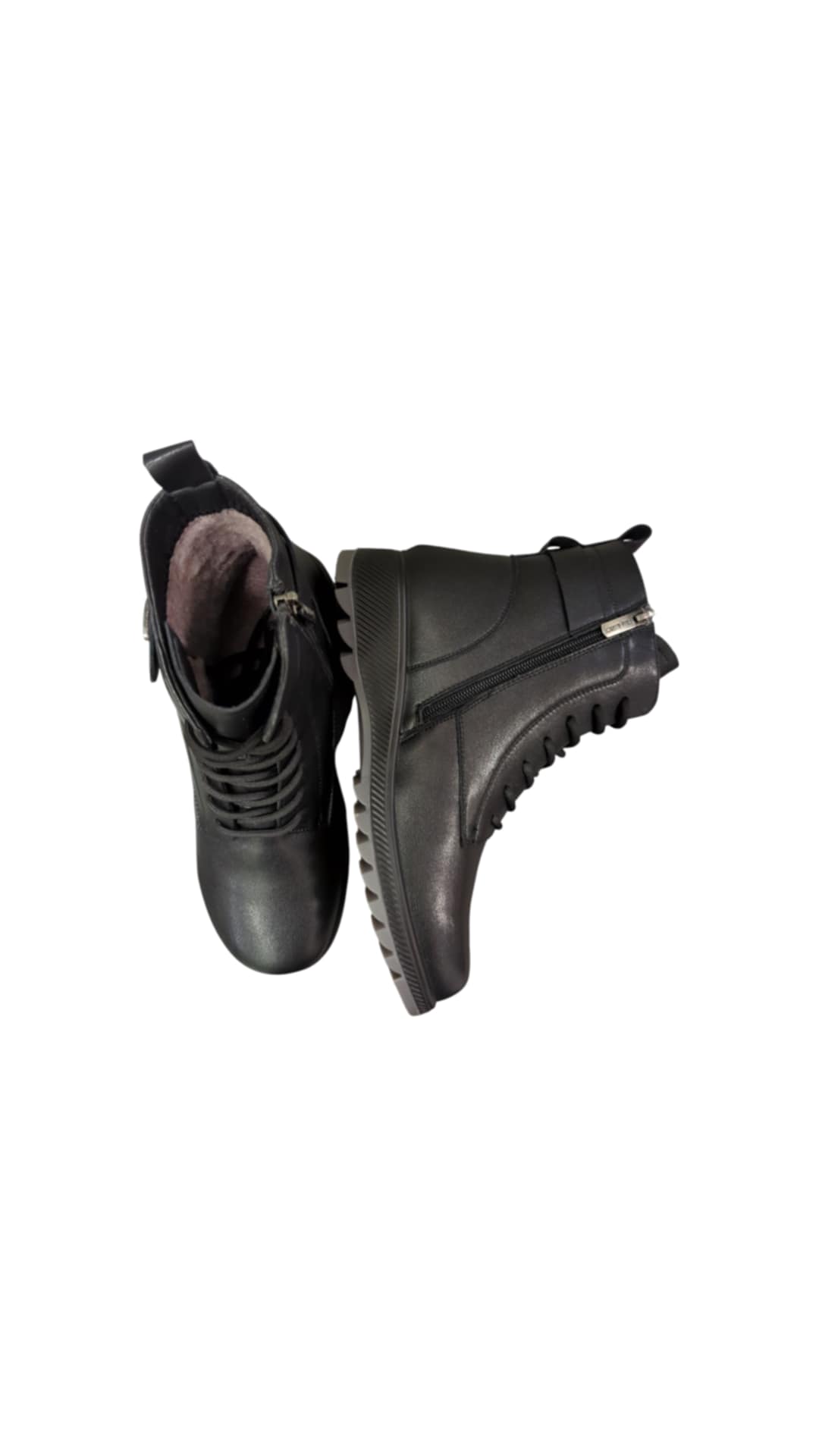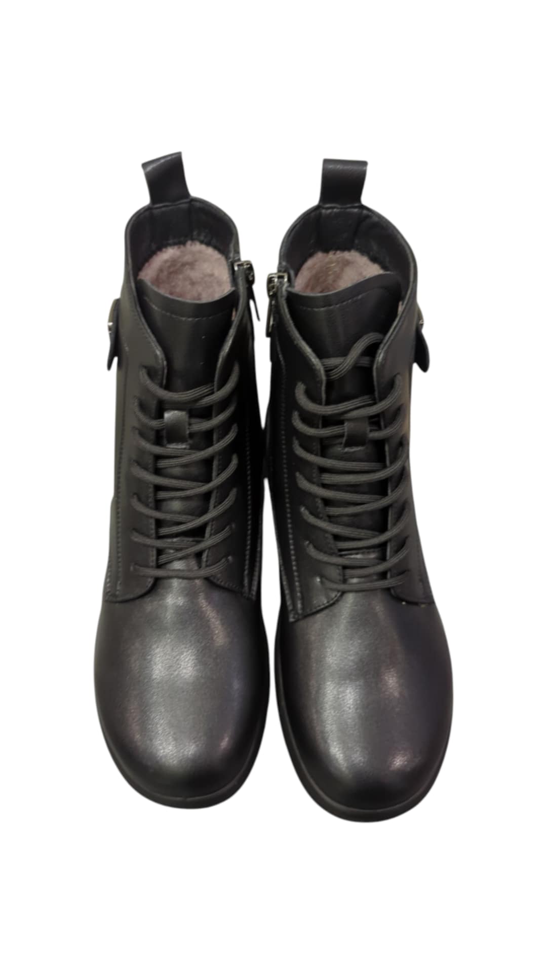 Moteriški, pašiltinti LORETTA VITALE juodos spalvos odiniai aulinukai, vidus sintetinis plonas flicas, užsegami užtrauktuku ir suvarstomi. Pašiltintas eko vilnos kailiukas