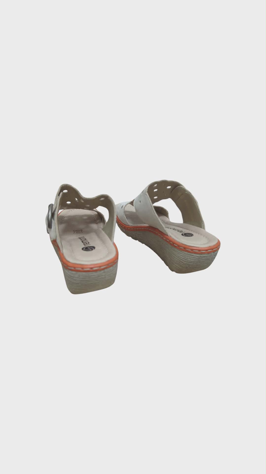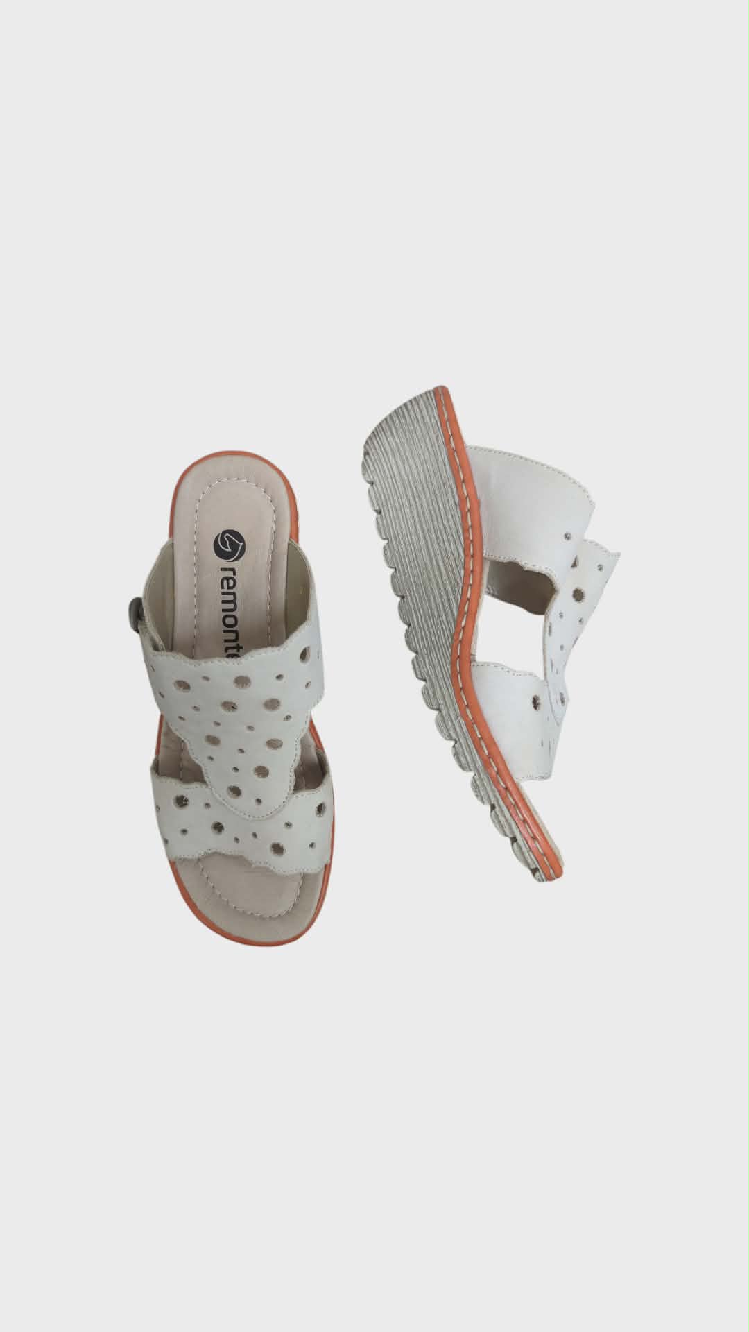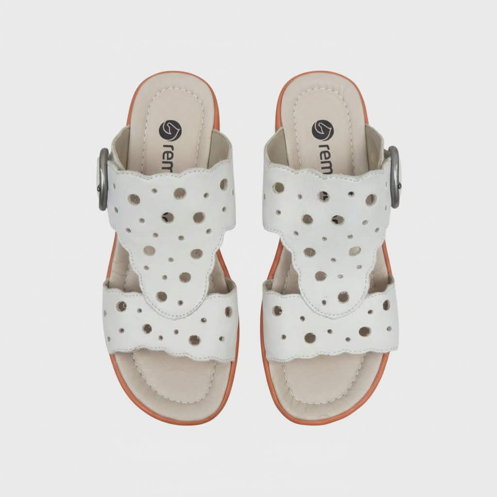 Lygios odos šlepetės –REMONTE– pilnai oda, pilno pado, vidus ir išorė, Padas ortopedinis, nepavargsat pėda, vidutinio storio padas ir paaukštinta pakulne, atvirais pirštais, pilnai dengia kauliukus, platus priekis, su dviem dirželiais.