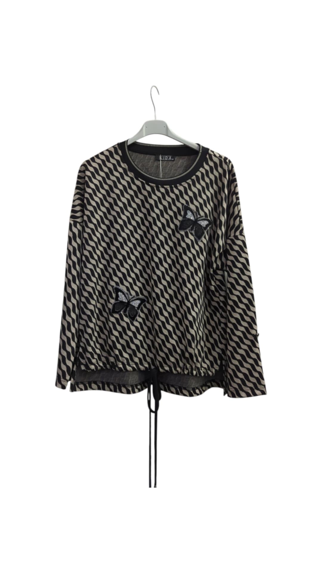 Spalva : pilkas pagrindas – juodos bangelės, puošta dviem drugelių aplikacijom.