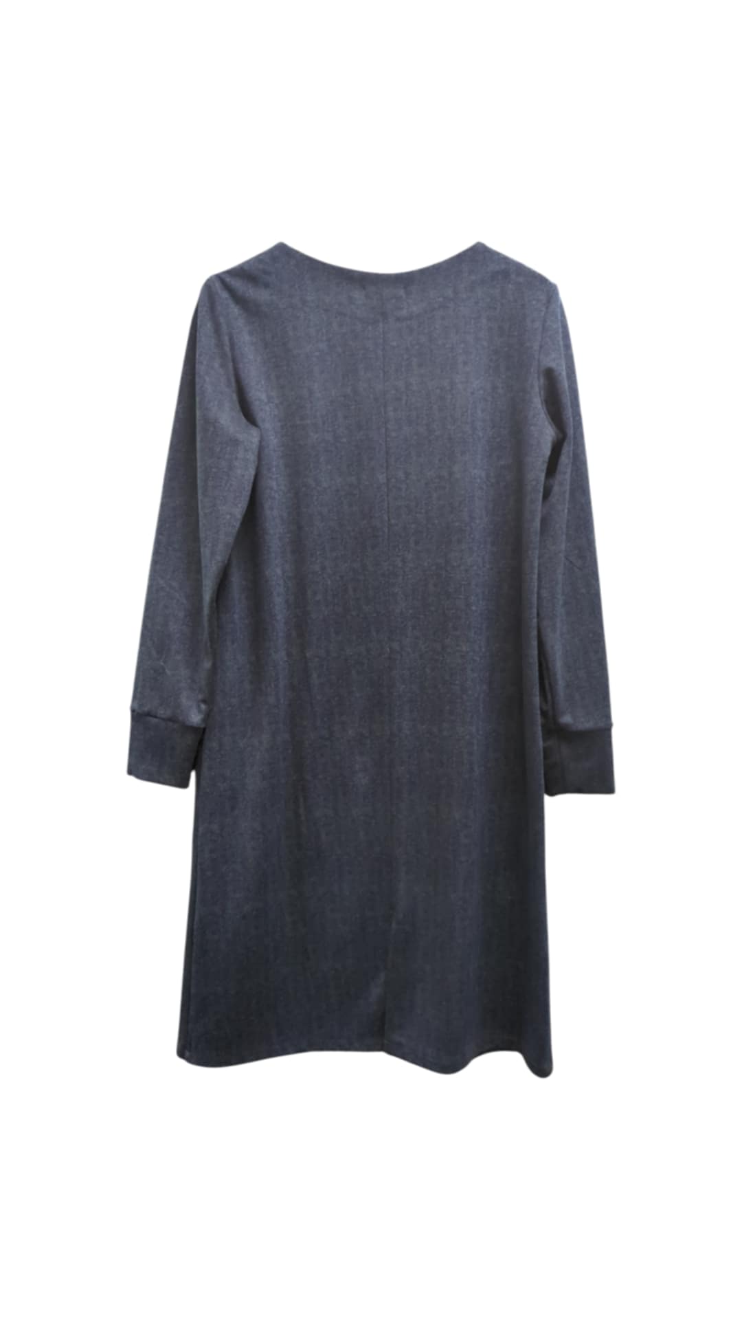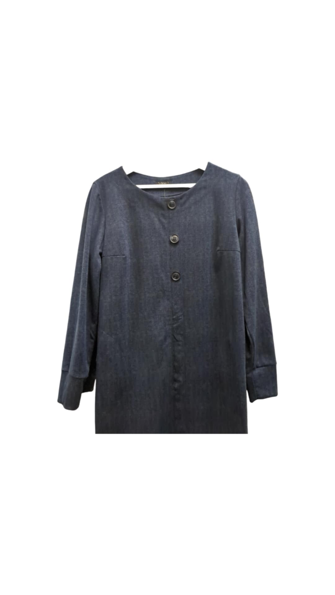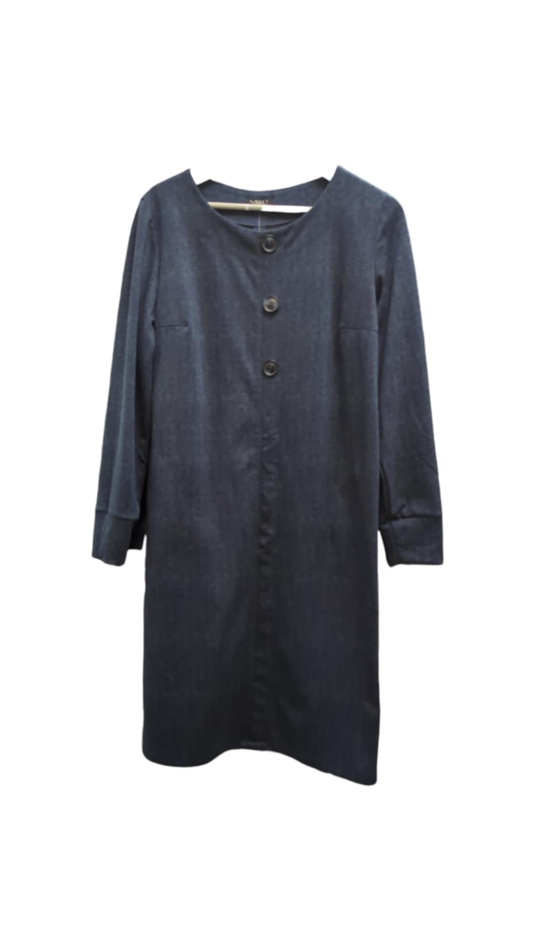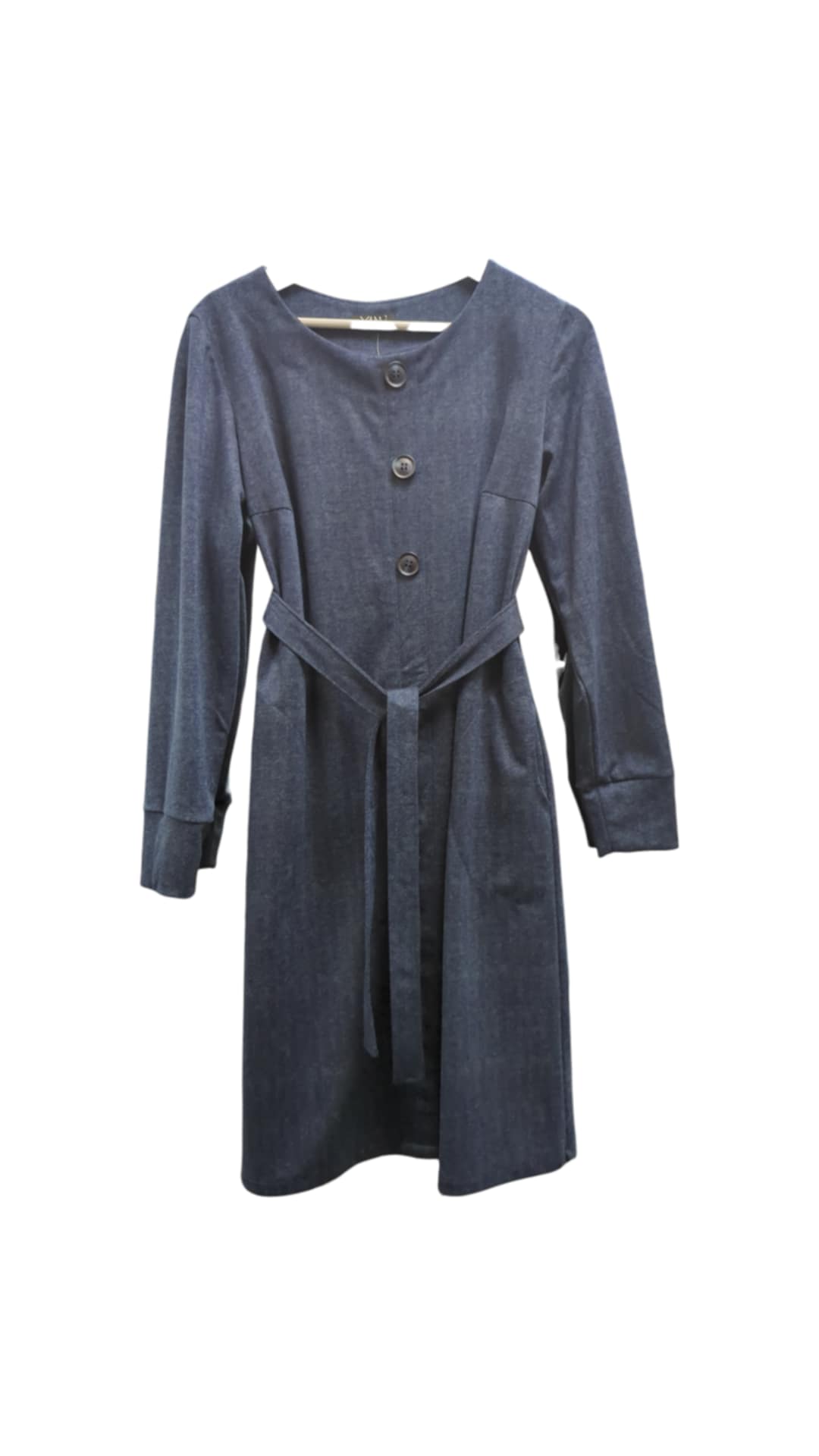 VAAU – džinsinė, midi ilgio suknelė. Tai suknelė laisvo silueto, su kišenėmis, priekyje su sagutėmis, patogi dėvėti. ovalia kaklo iškirptė, su apkantuota krūtinės linija dekoratyvia juostele, laisvai krintanti, labai lengva.